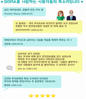 이 서비스를 기획하고 추진하기까지 2년이라는 시간을 걸렸습니다. 2013년도 2월에 오픈 하여 벌써 만 3년이 넘은 서비스입니다. DOMA서비스 출시인 2013년, 당시 업계에서는 아무도 시도 하지 않았던 소셜로그인(Oauth), 실시간 정보 무료제공, SNS결합 모델로 주목을 받았습니다. 이후에도 고객들에게 좋은 컨텐츠와 서비스를 제공하여 주식 서비스 분야에서 자리매김을 하기 위해 꾸준한 개편을 진행하고 있습니다.