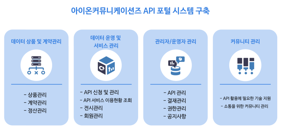 이번 프로젝트에서 아이온커뮤니케이션즈는 데이터 상품 및 계약관리, 운영 및 서비스관리, 관리자기능, 커뮤니티 관리까지