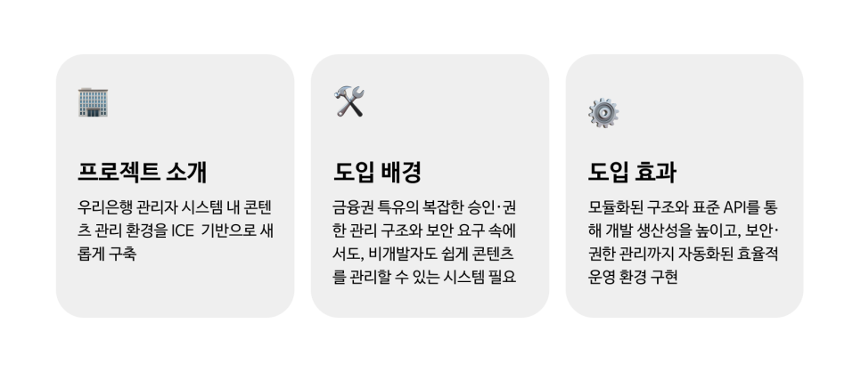 우리은행은 관리자 시스템 내에서 다양한 서비스 화면과 콘텐츠를 효율적으로 관리하고, 변경사항을 빠르게 반영할 수 있는 체계를 구축하기 위해 ICE를 도입하였습니다. 특히 금융권 특유의 복잡한 승 인 절차와 보안 요건을 충족하면서도 운영자가 직관적으로 콘텐츠를 수정·승인·배포할 수 있는 안정 적인 관리 환경을 마련하고자 했습니다.