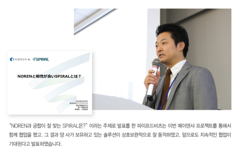 (좌측) 일본 총판매대리점인 (주)아시스토의 이사이자, 아이온커뮤니케이션즈의 제품만을 취급하는 (주)노렌의 대표이사인 카츠타 마코토 사장님의 인삿말을 시작으로 각 영업 담당이 전체 프로그램을 진행하였습니다. 파트너의 성공이 곧 NOREN(I-ON Content Server의 일본 제품 브랜드)의 성공이라고 밝히면서 앞으로도 지속적인 협조와 협력을 요청하였습니다.