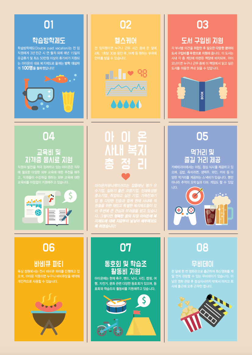아이온커뮤니케이션즈는 이러한 다양한 복지제도를 통해 직원들이 더욱 행복한 마음으로 즐기며 일할 수 있는 근무환경을 만들기 위해 항상 노력할 것이고, 앞으로도 아이온만의 재밌고 특별한 복지제도에 대해 많은 관심과 성원을 부탁드립니다. 감사합니다.^^