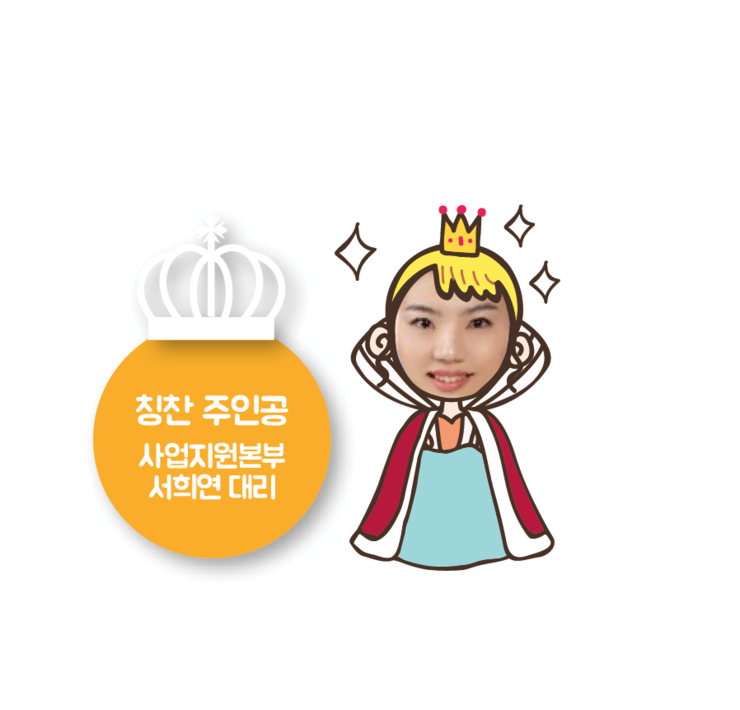 제가 영광스럽게 제일 처음으로 칭찬할 아이오닌은 사업지원본부의 서희연 대리입니다. 다 아는 사실이겠지만, 서희연 대리는 항상 밝은 얼굴로! 우리 아이오닌을 보면 먼저 인사하고! 상대방이 뭘 필요로 하는지 항상 묻고 이를 도와주고자 하는 얼굴이 가득 차 있을 정도로! 밝은 에너지의 소유자로 정말 정말 사람을 기분 좋게 만들어주는 에너지를 가진 훌륭한 친구입니다.