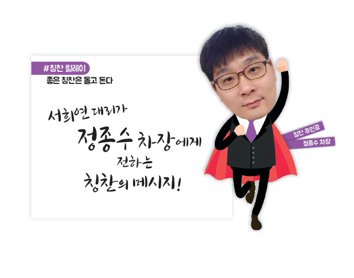 먼저 생각지도 못한 “첫 번째” 칭찬 대상자로 선정되어 매우 영광입니다. 각 본부에 최선을 다하시는 분들이 많이 계시는데 먼저 받게 되어 죄송함과 추천해주신 양재혁 이사님께 감사의 마음을 전합니다. 이번을 계기로 앞으로도 더 칭찬받을 수 있는 사람이 되도록 노력하겠습니다!!