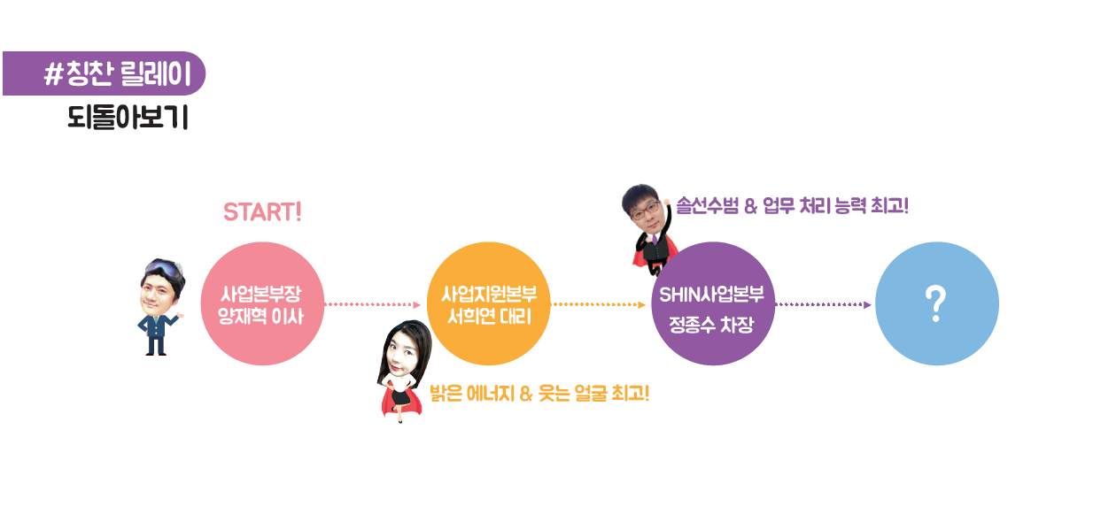 지난달 훈훈한 사연과 함께 양재혁 이사가 서희연 대리를 칭찬한 첫 칭찬릴레이를 성공적으로 마치고, 드디어 두 번째 칭찬릴레이가 진행됐습니다~!! 이번에는 첫 번째 칭찬 주인공인 서희연 대리가 감동의 사연과 함께 두 번째 칭찬 주인공을 선정했는데요! 과연 그 행운의 주인공은 누구일까요?? 지금 만나러 가요~~