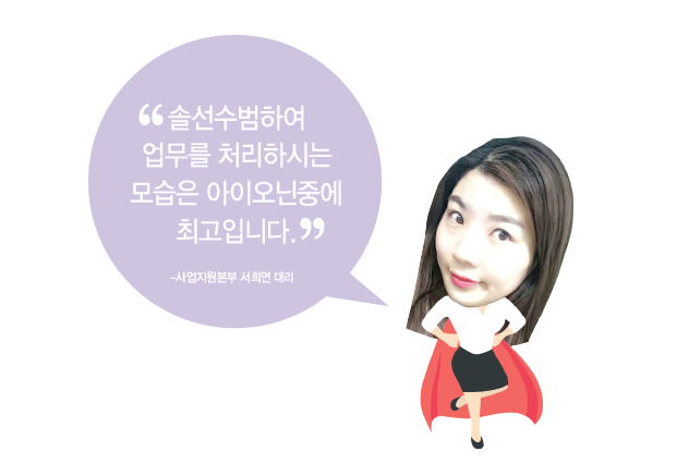 이런 장점들을 살려 누구보다 먼저 솔선수범하며 사우회 업무를 빠르고 정확하게 처리를 해주셔서 직원들이 “매우 만족스러웠을 거다” 라는 생각이 들었습니다. 그리고 사우회 업무뿐만 아니라, 본부 간의 업무 처리에 있어서도 책임을 다하여 내일처럼 진행해주셔서 제가 훨씬 수월히 업무 처리를 할 수 있었습니다.