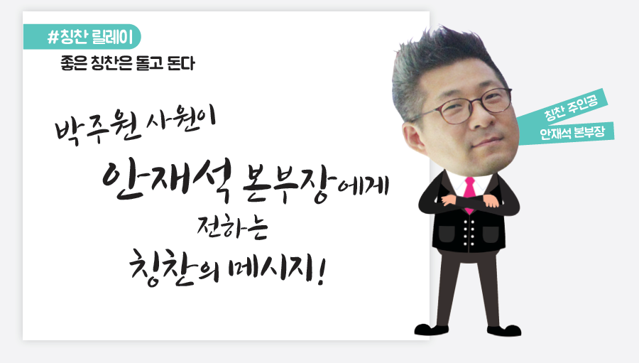 이제 이번 칭찬 릴레이의 “여섯 번째” 주인공을 말씀드릴 차례인데요. 바로 얼마 전 신규로 개설된 ET(Event Tech) 본부의 안재석 본부장님입니다! 안재석 본부장님은 항상 밝은 모습으로 보는 사람 모두를 즐겁게 하는 매력이 있으십니다. 그리고 저는 항상 고정관념이라는 틀에 박힌 생각을 가지고 살았었는데, 이런 저에게 안재석 본부장님께서는 옆에서 다양한 이야기를 해주시고, 그것을 통해 새로운 관점에서 볼 수 있도록 도와주셔서 참 고맙고, 감사했습니다.