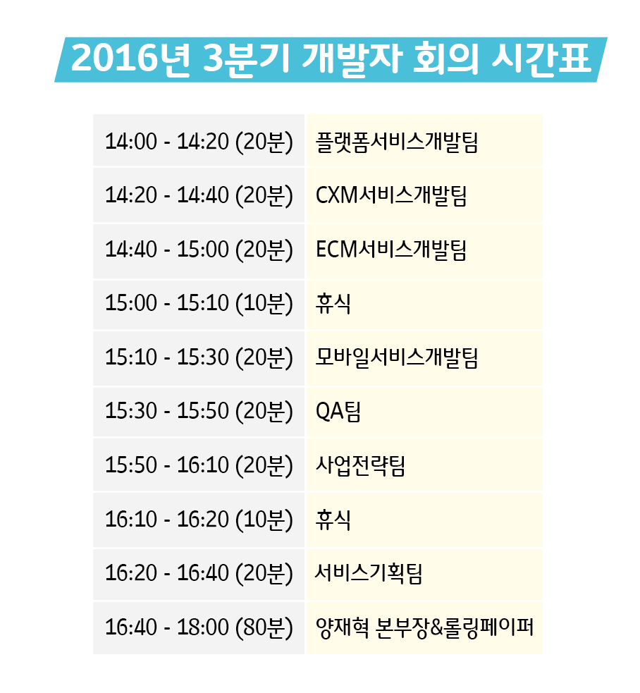 이번 회의에 발표 진행 순서로는 먼저 신규 입사자들의 간단한 자기소개를 시작으로 플랫폼 서비스 개발팀, CXM 서비스 개발팀, ECM 서비스 개발팀, 모바일 서비스 개발팀, QA팀, 사업전략팀, 서비스 기획팀 순으로 각 팀의 팀장이 발표를 진행하였으며, 발표 내용 중간중간에 재밌는 이미지와 동영상들이 많아 보는 사람이 지루하지 않게 발표가 이어졌답니다.