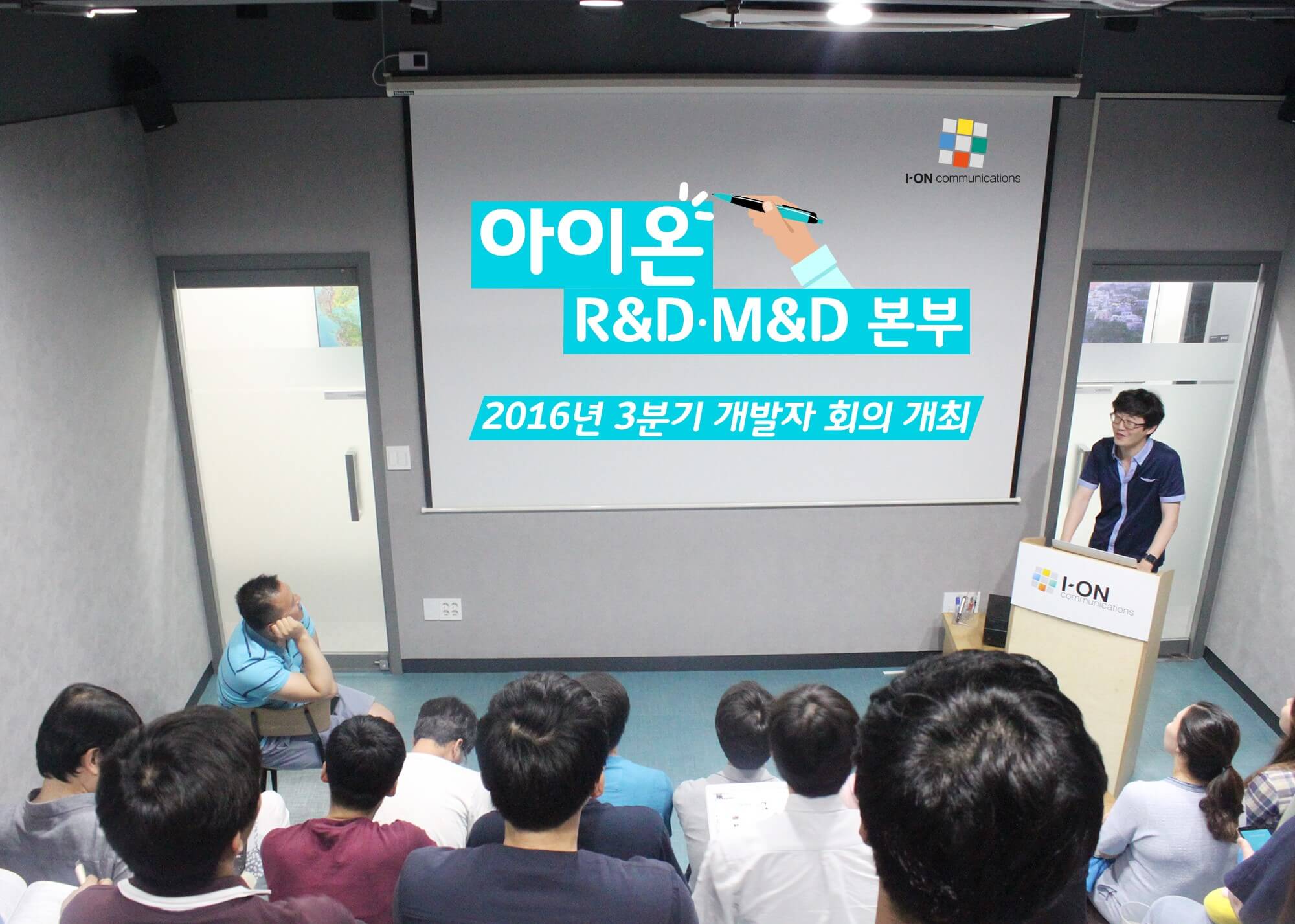 지난 7월 7일, 아이온커뮤니케이션즈 지하 1층 오디토리움에서 ‘2016년 R&D, M&D본부 3분기 개발자 회의’를 개최했습니다. 이번 회의는 오후 2시부터 6시까지 총 네 시간 동안 약 50여 명의 R&D, M&D본부 아이오닌이 모여 진행됐고, 본 회의에서는 각 팀별 상반기 진행했던 업무와 앞으로의 업무계획을 20분씩 짧게 발표하는 시간을 가졌습니다.