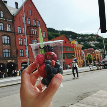 노르웨이 베르겐의 어시장을 구경하던 중, 블루베리와 라즈베리 등 다양한 종류의 딸기를 컵에 담아 판매하는 부스를 보았습니다. 맛있어 보여서 한 컵을 구매했는데, 실수로 금액 결제를 많이 해버렸더군요. 그러자 딸기를 판매하던 가족이 저에게 미안하다며 상황 설명을 하고, 차액을 현금으로 주겠다고 했으나 제가 대답을 머뭇거리니 결국 딸기 한 컵을 더 주었습니다. 하마터면 금액 확인을 안하고 넘어갈 뻔했는데, 결과적으론 저에게 꽤 이득이었네요.