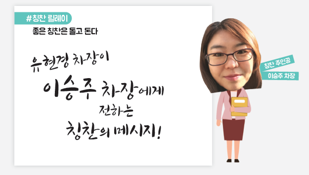 안녕하세요 디자인팀 유현경 차장입니다. 먼저 저를 칭찬릴레이 주인공으로 지목해주신 SDP사업본부 박진우 차장님께 감사하다는 말씀 드립니다. 디자인팀의 일원으로서 맡은 바를 해온 것인데 칭찬까지 해주시다니 정말 고맙습니다.
