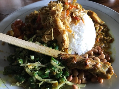 이 음식집은 현지인들의 맛집으로 유명한 울루와뚜 부근 나시아얌 이부오끼입니다. 이곳에서 밥과 야채, 치킨, 발리니스 스파이스 소스, 치킨사테 등으로 구성된 덮밥을 먹었는데요. 매콤한 맛이 입맛을 사로잡았습니다.
