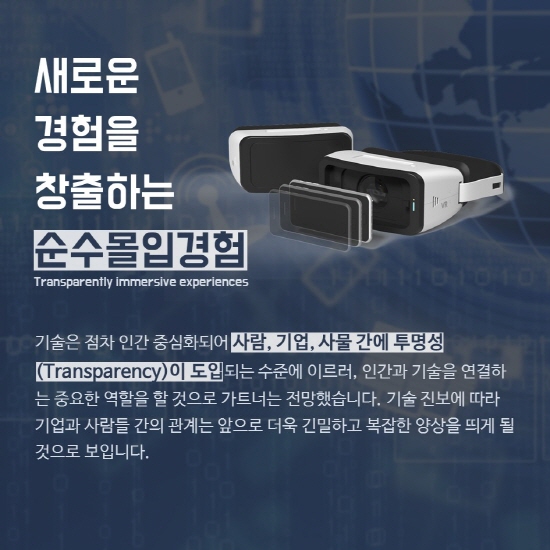 기술은 점차 인간 중심화되어 사람, 기업, 사물 간에 투명성(Transparency)이 도입되는 수준에 이르러, 인간과 기술을 연결하는 중요한 역할을 할 것으로 가트너는 전망했습니다. 기술 진보에 따라 기업과 사람들 간의 관계는 앞으로 더욱 긴밀하고 복잡한 양상을 띄게 될 것으로 보입니다.