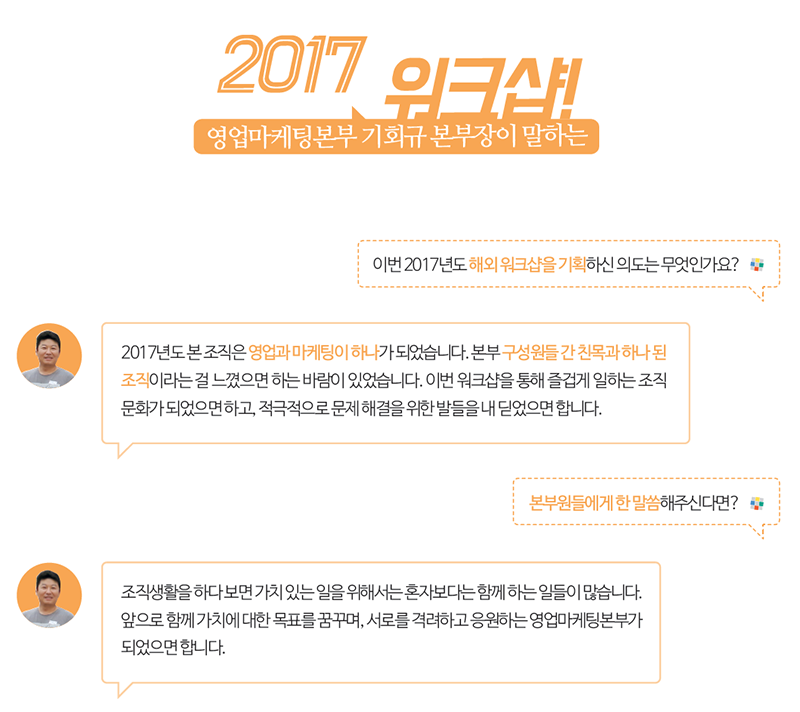 그럼 지금부터 직원들이 추천하는 방콕의 맛집과 장소에 대한 꿀Tip도 얻어 갈 수 있는 이번 '2017 영업마케팅본부 워크샵'에 대해 함께 보실까요~?