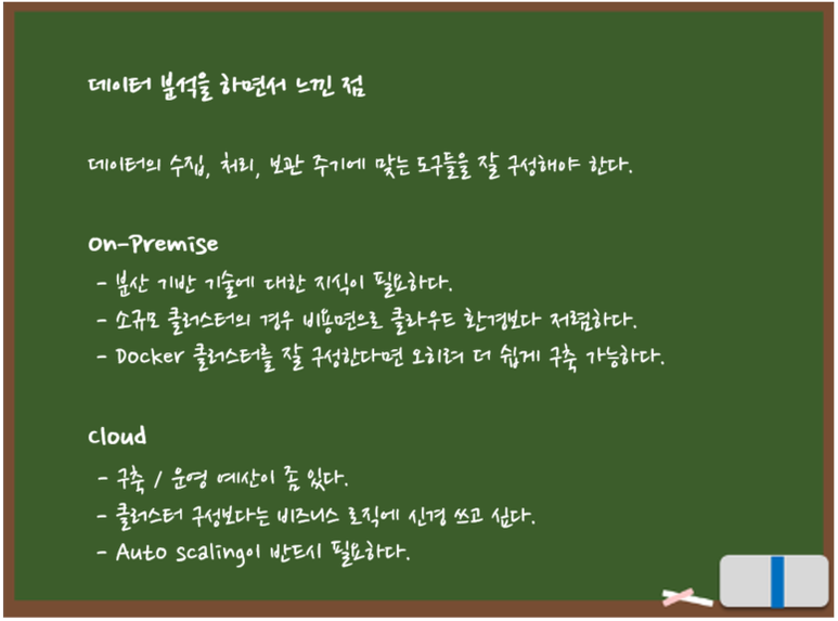 부족했던 부분을 보완한 결과물의 데모 버전을 시연하면서 세미나에 참석한 직원들의 이목을 집중시켰는데요. 오랜 기간 동안 데이터 분석을 하면서 느낀 점에 대해 이야기할 때, 사용 주기와 재사용성 여부에 따른 코드 선택, 저장하는 데이터의 포맷과 그 데이터를 어떤 식으로 쿼리 할 것인지에 대해 자세히 설명해 주셨습니다.
