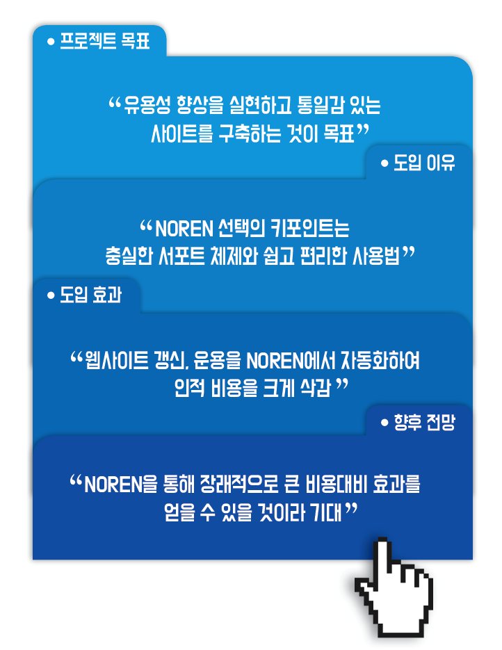 많은 CMS 제품 중에서 NOREN을 선택하게 된 이유는 동사에서는 최종적으로 선정된 3개의 제품에 대해 실제로 이용하고 있는 기업에 자문을 구했고, 실제 검증을 수행하며 도입을 결정하고자 했습니다.