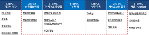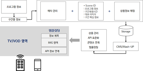 광고, 부가정보, 상품 정보 등과 프로그램에 대한 정보 입수 및 메타 관리로 정보 매칭을 구성하며, 영상에 대한 구간별 정보를 상품 메타 정보와 매칭하여 Mash-Up 서비스를 화면에 제공하는 방식을 갖는다. 이렇게 메타 정보와 상품 정보 간의 매칭 된 정보는 Storage에 쌓이게 되며 Storage는 Repository 개념으로 검색/조회를 통해 빠르게 장면별 상품 정보 매칭이 가능하도록 구성한다.