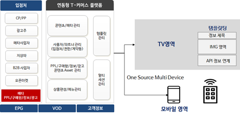 T-커머스 플랫폼은 기본적인 콘텐츠/메타 관리, 사용자/파트너 관리 기능을 갖고 있으며 상품 정보를 매칭하여 정보를 TV와 모바일에 함께 제공한다. 입점처는 PP사, 광고주, 광고 대행사 등 서비스에 관련된 사용자들이 접속하고 관련 정보를 제공할 수 있도록 사용자/파트너관리, 관련 콘텐츠/메타 관리, PPL/구매형/정보/광고등의 콘텐츠 Asset관리, 상품 편성/메뉴 관리, 템플릿 관리, 멀티 세션 관리, EPG/VOD/고객 정보 등 연동 관점의 핵심 구조로 설계함으로써 TV에 관련된 상품을 적시에 노출하는 것과 모바일에서 관련 정보를 획득할 수 있도록 한다.