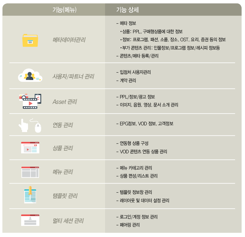 각 정보에 대한 기본적인 콘텐츠 관리를 위해서는 EPG 정보, VOD 정보, 고객 정보와의 연동 관리가 필요하며 각 프로그램과 연동된 상품 정보를 제공하기 위해 상품 관리 기능과 메뉴 관리 기능이 필요하다.
