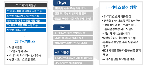 인터넷 쇼핑과 모바일 쇼핑의 지속적인 성장으로 TV 홈쇼핑 + 인터넷 쇼핑 + 모바일 쇼핑이 결합된 형태의 서비스들이 지속적으로 제공되고 있지만, 각 쇼핑 채널이 갖고 있는 한계성과 시스템 운영 및 환경적인 특성으로 융합될 수 없는 한계성으로 인해 각 사업자의 독립적인 T-커머스 서비스만이 제공되어 왔다.