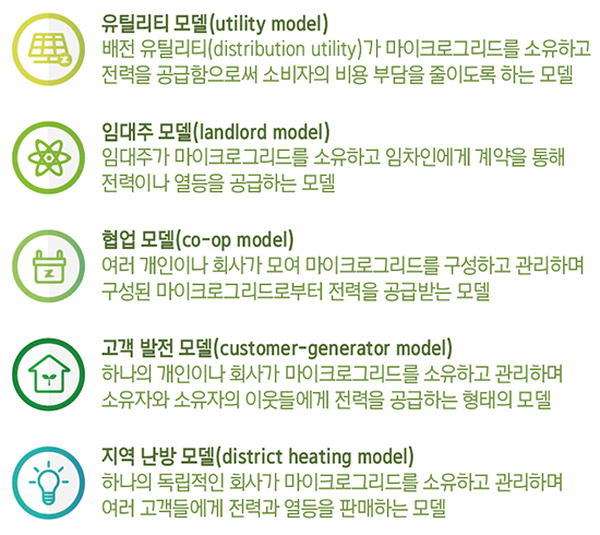 우선 마이크로 그리드는 다루는 전력의 크기에 따라 주거용, 소상업용, 상업용으로 구분됩니다. 그리고 용도에 따라서는 군사용, 캠퍼스용, 커뮤니티용 마이크로 그리드 등으로 구분할 수 있는데요. 또한 동작 모드에 따라서는 계통 연계형, 독립형으로 구분되기도 합니다. 미국의 에너지국은 마이크로 그리드의 소유자에 따른 소유 모델(Ownership Model)을 정의하기도 했는데요. 그 소유 모델은 다음과 같이 나눌 수 있습니다.