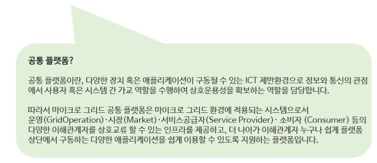 따라서 마이크로 그리드용 공통 플랫폼은 마이크로 그리드 환경에 적용되어 운영·시장·서비스공급자 등의 다양한 이해관계자가 공통 플랫폼을 통해 누구나 쉽게 상호 연동할 수 있는 인프라를 제공하고, 더 나아가 누구나 쉽게 서비스를 이용할 수 있도록 지원하여야 합니다.