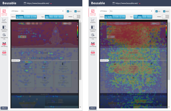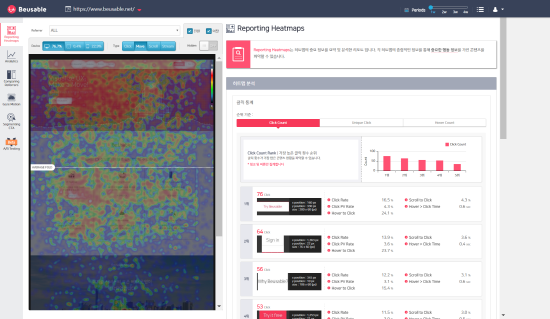 [뷰저블에서 확인할 수 있는 마우스 클릭 히트맵과 마우스 무브 히트맵]