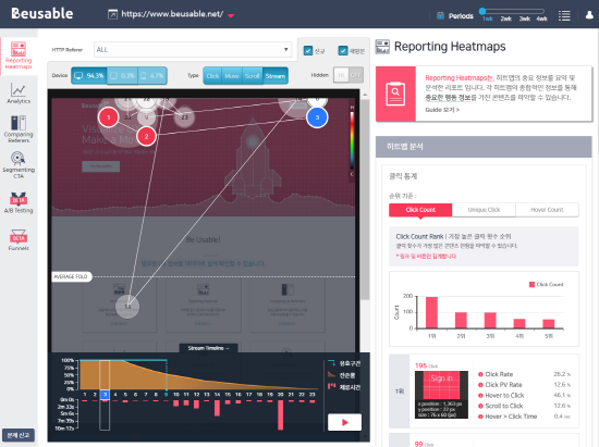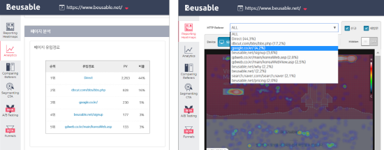 [뷰저블에서 확인할 수 있는 유입 정보(경로별 수치와 히트맵 Segment)]