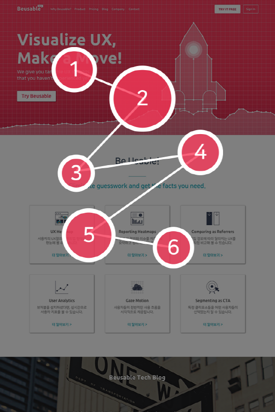 일반적으로 아이트래킹이라는 시선의 움직임을 추적하고 기록하는 도구를 활용하여 Gaze Plot을 생성하여 분석을 한다. 아이트래킹 도구의 활용이 아니더라도 웹 사이트에서 마우스 움직임을 추적하고 기록하여, 마우스가 어떤 위치에서 얼마나 체류하였는지, 그리고 콘텐츠들을 훑어본 순서 등을 파악할 수 있다.