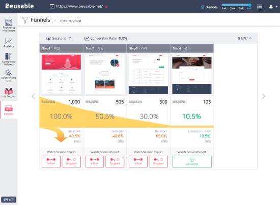 [뷰저블에서 확인할 수 있는 Funnels 기능(각 페이지 단계별)]