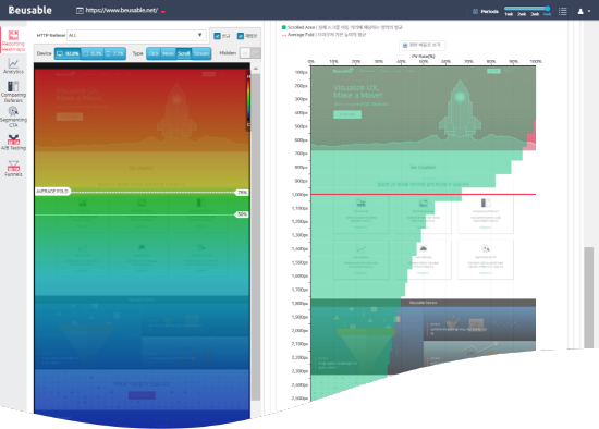 [뷰저블에서 확인할 수 있는 스크롤 도달율 히트맵과 차트 그래프]