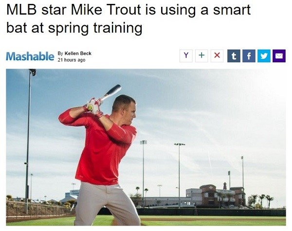 [그림] 스프링캠프에서 스마트배트를 통하여 스윙을 분석하는 마이크 트라우트 (이미지출처 : Mashable 기사 화면)