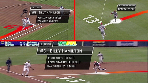 [그림] MLB에서 활용하고 있는 스텟케스트(StatCast). 공의 궤적뿐 아니라 주자의 반응속도 타자의 달리기 속도 등을 실시간으로 중계화면에 표시하여 시청자들을 더욱 즐겁게 한다. (이미지출처 : MLB.com)