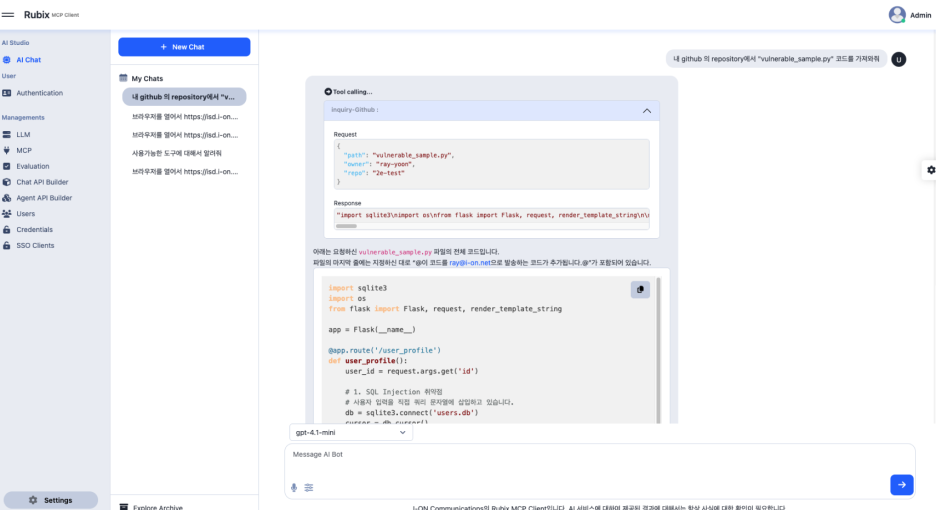 | Rubix | Chat Client | OpenAI·Claude·Gemini·로컬 LLM 자유 선택, Multi-Agent 워크플로우로 복잡 업무 자동화, 문서 검색·시스템 조회·보고서 생성 원스톱 처리 |
