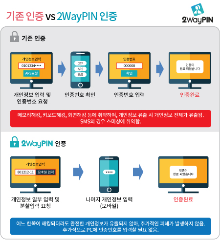 2WayPIN은 모바일 앱 또는 ARS를 통해 PC에 입력할 개인정보의 일부를 모바일에 바로 입력하는 방식으로 별도 임시번호를 받고 PC에 다시 입력하는 종전의 OTP, SMS 방식 인증보다 빠르고 편리하게 이용할 수 있습니다.