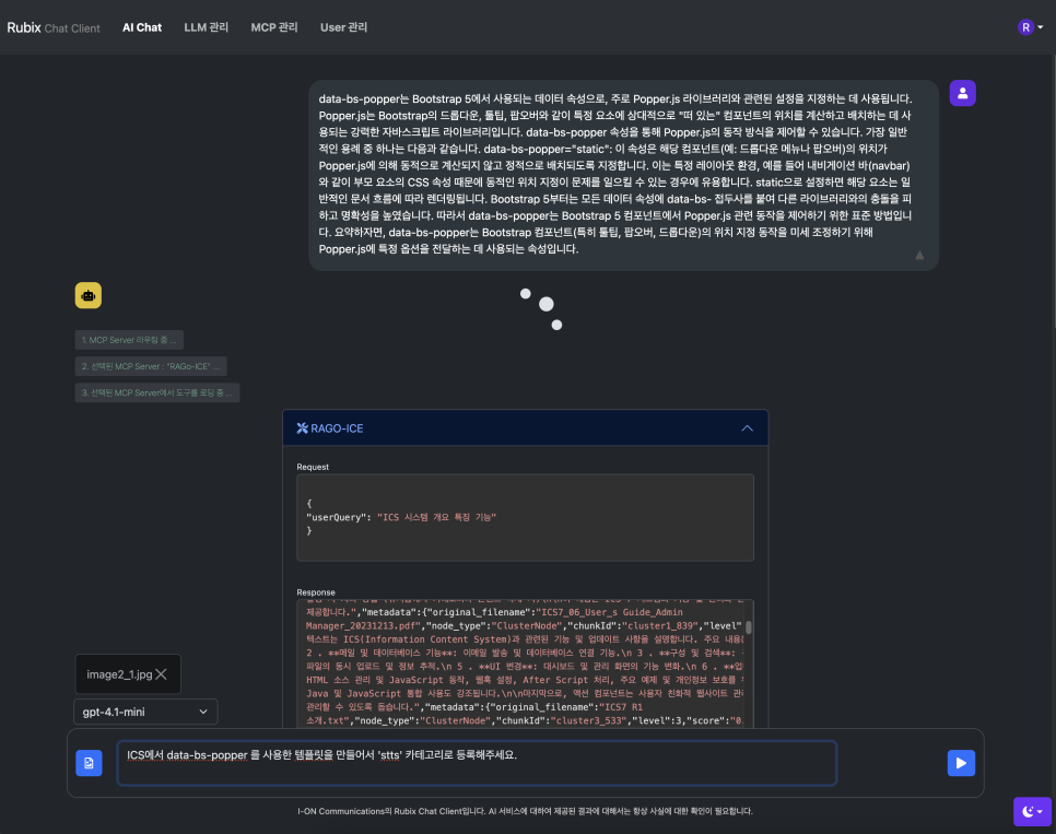 Rubix는 사용자와 직접 소통하는 MCP 기반의 대화 클라이언트입니다. 하나의 질문에 여러 역할의 AI 에이전트가 동시에 작업해 더 복잡한 요청도 처리할 수 있도록 지원합니다.