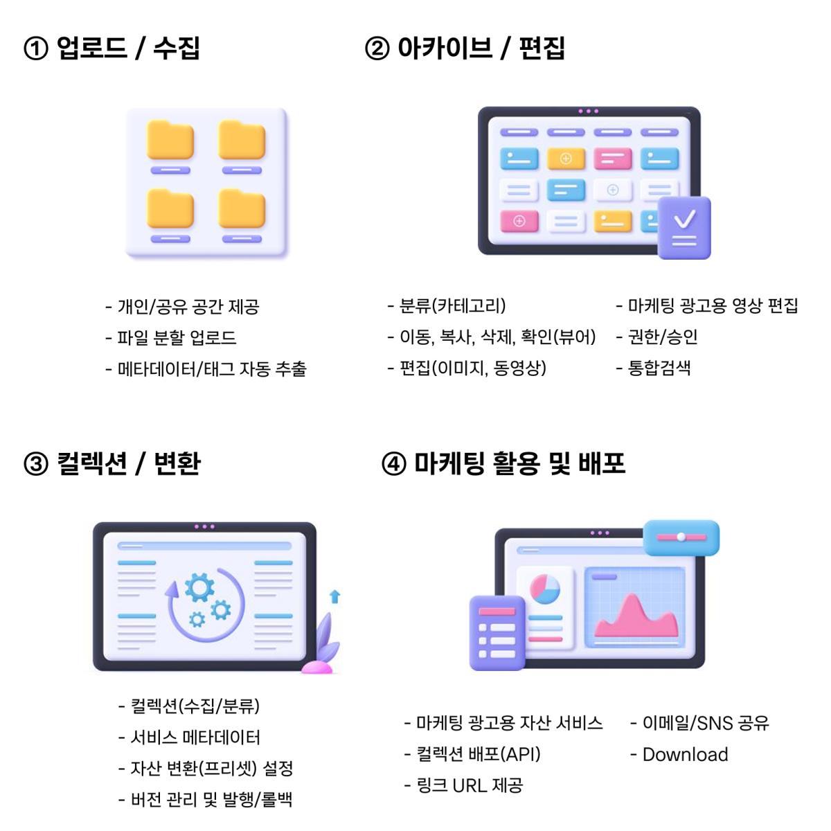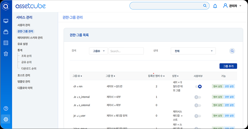 등록된 자산을 활용용도와 서비스 목적별로 분류하여 그룹(모음집) 만들기를 구성할 수 있습니다.
