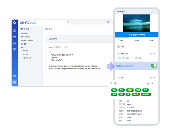 구글 이미지 분석 기술 + AI를 활용해 이미지를 수백만 개 카테고리로 빠르게 분류하고 자동 태그를 생성합니다.