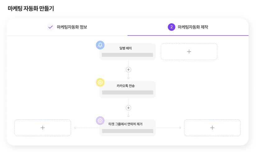 고객의 행동을 트리거로 설정해, 미리 구성한 시나리오에 따라 메시지나 페이지가 자동으로 발송됩니다. 신규 회원가입 시 환영 메시지 발송, 장바구니 미결제 고객에게 알림 발송 등 다양한 형태의 자동화가 가능합니다.