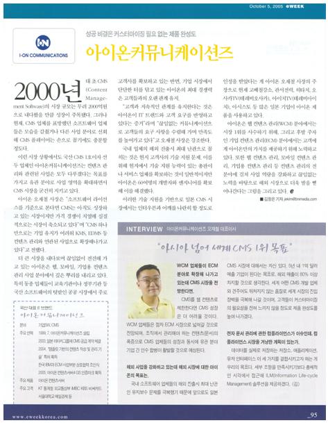 성공의 비결은 커스터마이징 필요없는 제품 완성도 아이온커뮤니케이션즈 등록일 2005/10/13 본문 2000년대 초 CMS (Content Management software)의 시장 규모는 무려 2000억원으로 내다봤을 만큼 성장이 주목 됐다. 그러나 현재 CMS 업체를 표방했던 소프트웨어 업체들은 모습을 감췄거나 다른 사업분야로 선회해 CMS 플레이어는 손으로 꼽기에도 충분할 정도다. (상세기사는 아래 내용 참고) 이전 목록