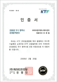 ㈜아이온커뮤니케이션즈, 2008 KTF 우수협력사 선정 등록일 2009/03/20 본문 KTF는 2009년 3월 10일자로 2008년 운영 분야 우수 협력사에 ㈜아이온커뮤니케이션즈를 선정하였다. 이번 수상을 통해 아이온커뮤니케이션즈는 2008년 한 해 동안 우수한 기술력과 노하우로 KTF 사업 발전에 기여한 노력을 인정받았다. 이전 목록